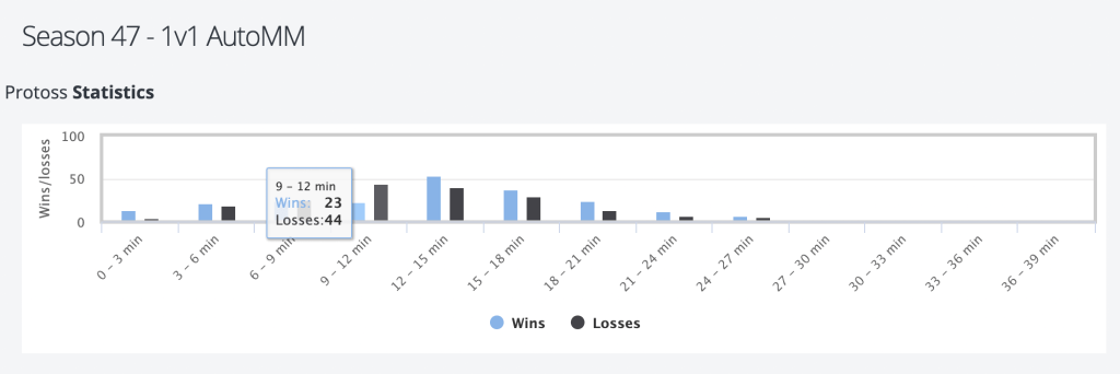 It was quite a shock for me to learn that I had decent win rates (>50%) in any game lengths except 9 – 12 min. For those of you who are not familiar with StarCraft II, you open your game by optimizing either army (more aggressive in early-to-mid game) or economy (weaker in early-to-mid game, but more likely to win in late game since your economy is better). After some digging I realized that I had been greedy and over optimistic about how efficiently I can optimize my economy regardless of what strategies my opponents adopted. Therefore, I lost many games when opponents tried to all-in me before I had a chance to fully tap into the economy and build a better army.